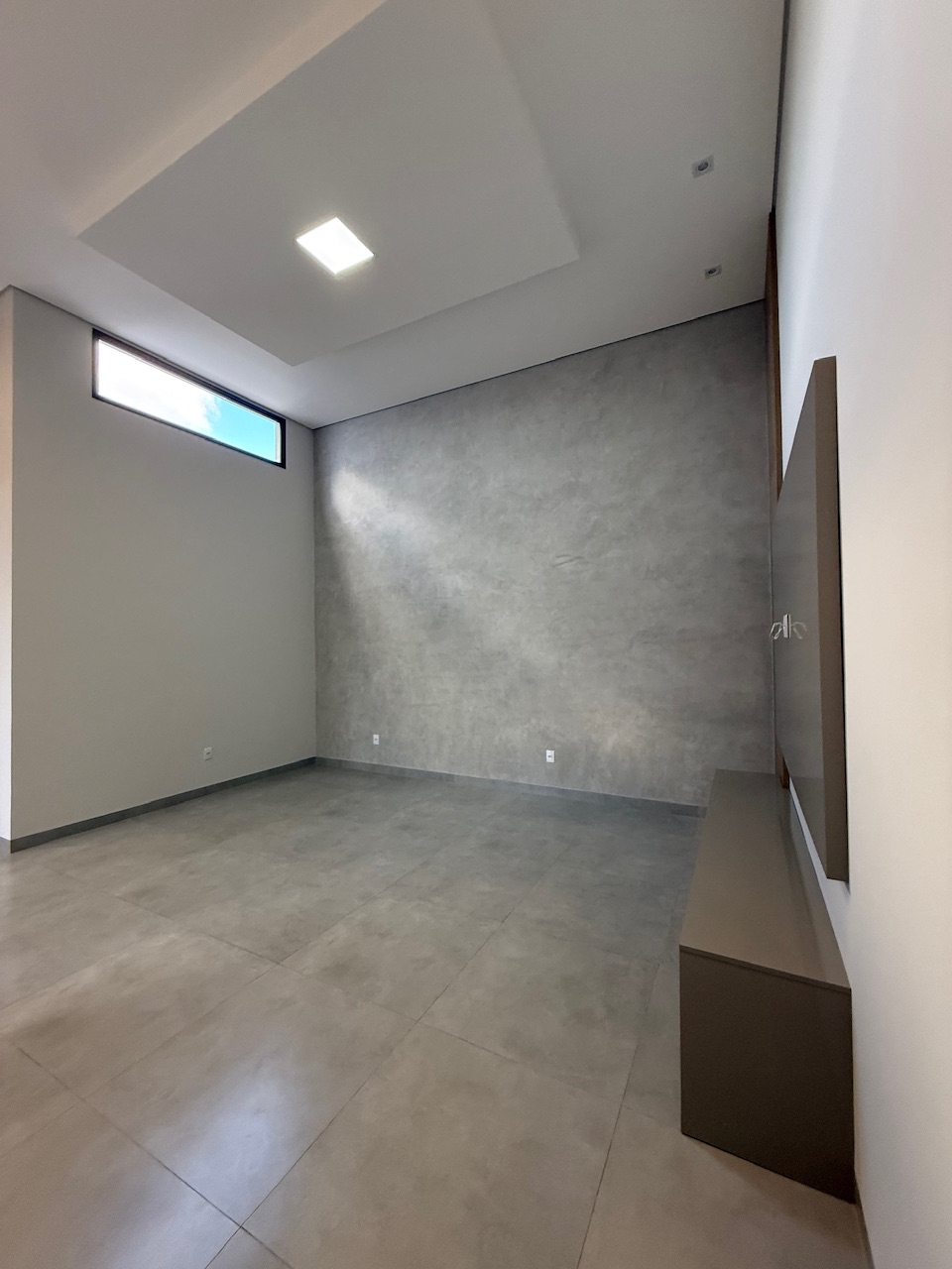 Sala com pé direito alto, parede com detalhe cimento queimado;